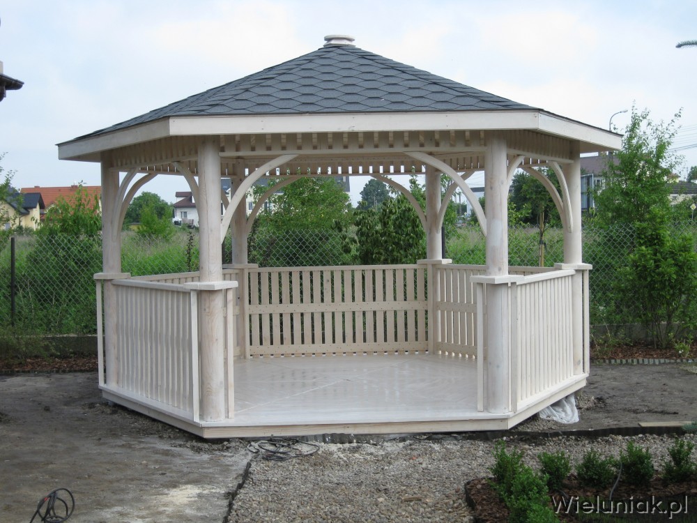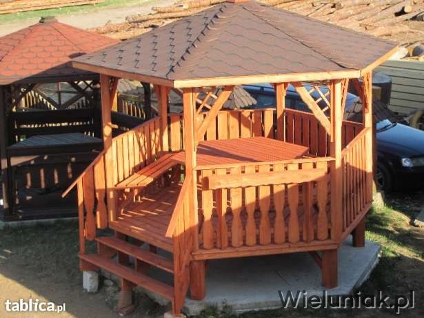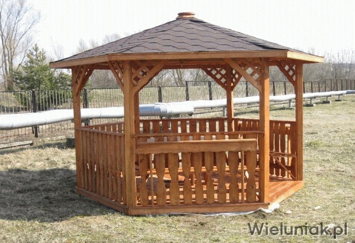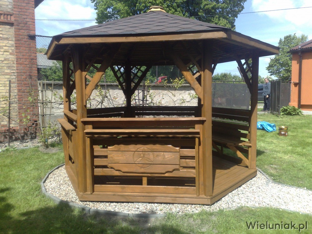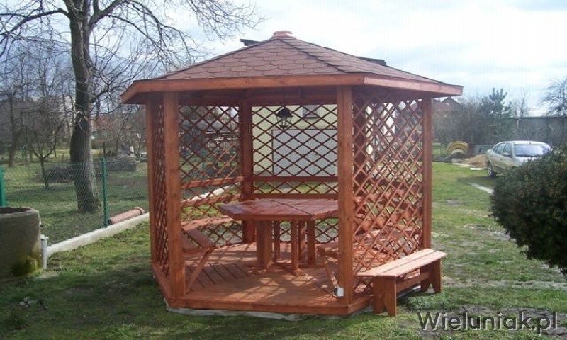Altany ogrodowe wykonywane są z drewna sosnowego. Każda altana drewniana jest ustawiana na odpowiednio rozmieszczonych i wypoziomowanych podkładach betonowych, które zabezpieczają przed gromadzeniem się wody pod podłogą altany i zapewniają cyrkulację powietrza pod podłogą. Stosujemy również agrowłókninę, której zadaniem jest zapobieganie przerastaniu roślinności między deskami podłogowymi. Słupy altany mają wysokość 200 cm, natomiast całkowita wysokość altany wynosi 270 cm. Dachy altan wykonane są z desek boazeryjnych oraz pokryte gontem bitumicznym co zapewnia długoletnią trwałość każdej altany oraz odpowiednie wrażenia estetyczne. Każda z altan wyposażona jest w zestaw mebli, na który składają się stół z sześciokątnym blatem oraz 5 ławek, zamocowanych do altany. Wszystkie elementy altany są odpowiednio strugane oraz dwukrotnie impregnowane. Na życzenie klienta możemy zamontować w altanie oświetlenie oraz dodatkowe kratownice. Wszystkie altany montujemy samodzielnie. Dostarczamy nasze produkty na terenie Polski oraz zagranicę. Koszty transportu uzgadniamy indywidualnie z każdym klientem.