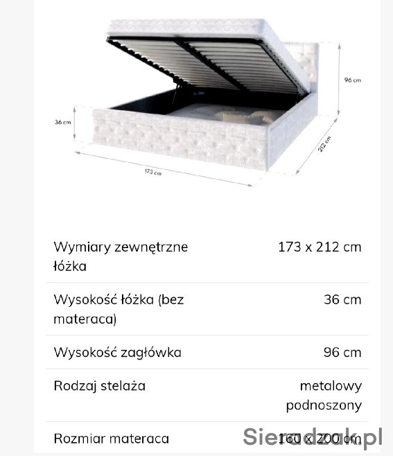 Podnoszony stelaż metalowy- Stelaż wspierany jest mechanizmem podnoszenia - dwa siłowniki gazowe. Posiada brzozowe sprężynujące listwy