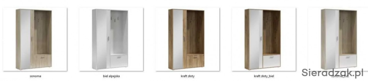 Garderoba z lustrem, oraz zabudowaniem BIS. Posiada na zewnętrznej stronie trzy wieszaki, idealne na kurtki, płaszcze czy bluzy i torebki. Poniżej znajduje się szafka na buty z przegrodą, co ułatwia organizacje. Szafa po lewej stronie posiada w sobie dwie półki. Jedną do góry a drugą na dole, pozwala to na umieszczenie na nich rzeczy, które wymagają położenia na płaskiej powierzchni. Nowoczesną opcją jest wysuwany wieszak, uwydatniający unikalność i funkcjonalność szafy. Dostępna w sześciu wybarwieniach.