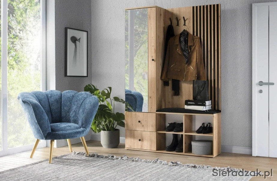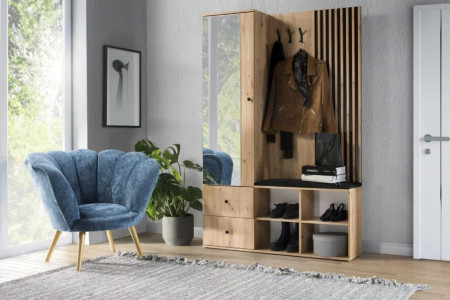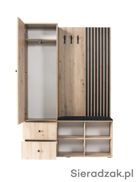Nowoczesna garderoba z lustrem w jasnym kolorze Artisan do przedpokoju. Idealne połączenie z naszą nową kolekcją CALI, gdzie wchodząc do mieszkania mamy przedsmak nowoczesnego stylu z wykorzystaniem lameli, idąc dalej, do salonu możemy przedłużyć tym samym stylem wystrój naszego wnętrza. Mebel jest niesamowicie funkcjonalny, ma wygodne półki na buty, dwie szuflady w których możemy schować podręczne rzeczy takie jak czapki, czy rękawiczki. Nad szafkami znajduje się obszerna szafa do wieszania ubrań. Garderoba ma wygodne, tapicerowane siedzisko w czarnym kolorze, które pasuje do tła na których są lamele. Swoje kurtki czy płaszcze możemy powiesić na trzech, metalowych wieszakach, które są tak skonstruowane, ze możemy powiesić na nich aż sześć ubrań, każdy na osobnym wieszaku! Ta garderoba to idealne rozwiązanie do wiatrołapu.