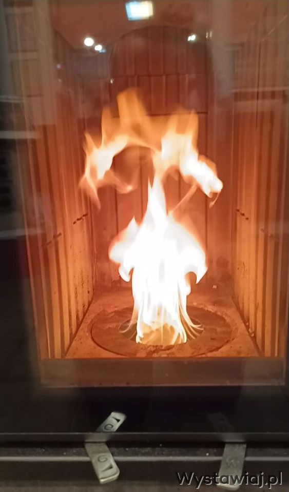 Film pokazujący urok i niezwykły czar palącego się płomienia z gazu drzewnego, w postaci widowiskowego gejzeru ognia, znajduje się powyżej ogłoszenia.