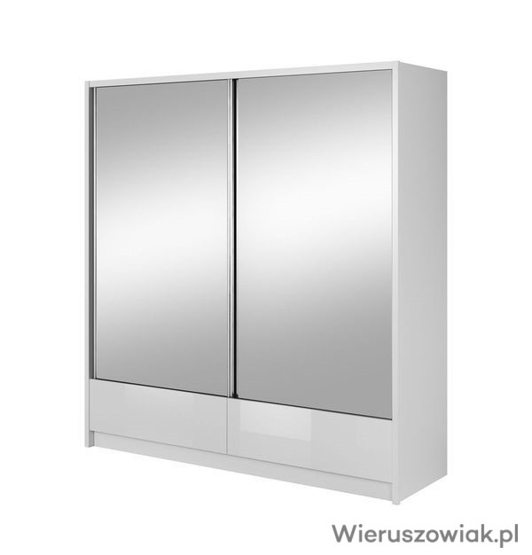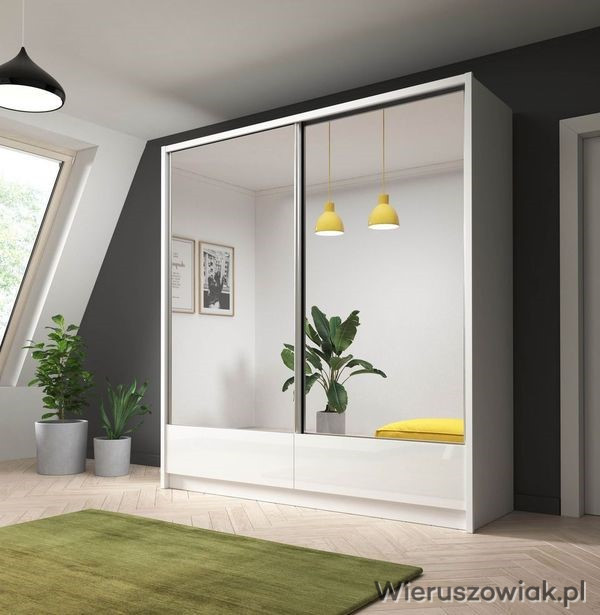 Szafa MIRA II z drzwiami przesuwnymi i lustrem w kolorze biały/biały połysk to elegancki i funkcjonalny element wyposażenia wnętrz. Oto jej kluczowe cechy: