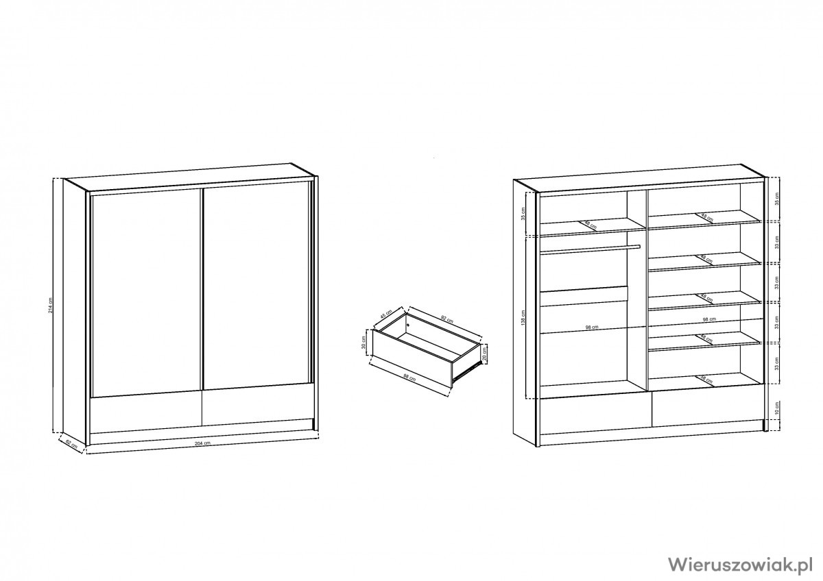 Pojemność: Wnętrze szafy jest przestronne, oferując dużo miejsca na ubrania, obuwie i akcesoria. Zazwyczaj wyposażona jest w półki i drążek na wieszaki.