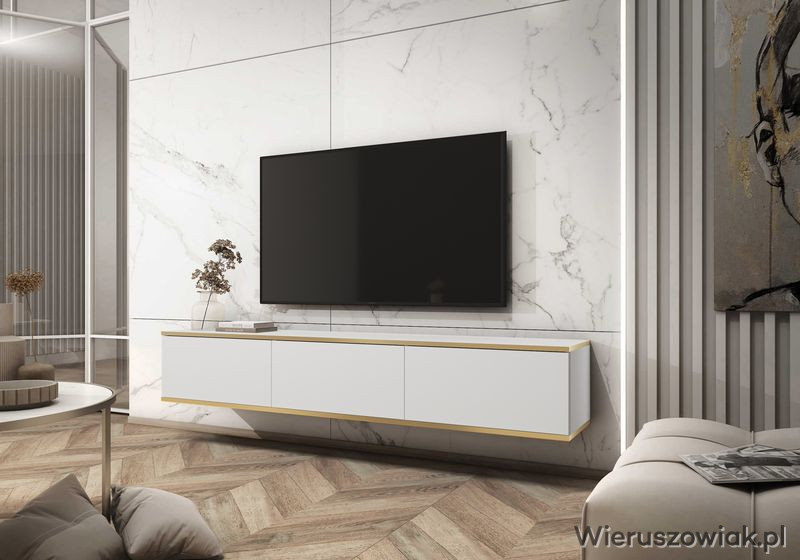 Odkryj elegancję i funkcjonalność w swoim wnętrzu dzięki wiszącej szafce RTV ALBA 175. Ta nowoczesna szafka, wyróżniająca się subtelnym połączeniem bieli z eleganckimi złotymi wstawkami, doskonale wpisuje się w aktualne trendy aranżacyjne.